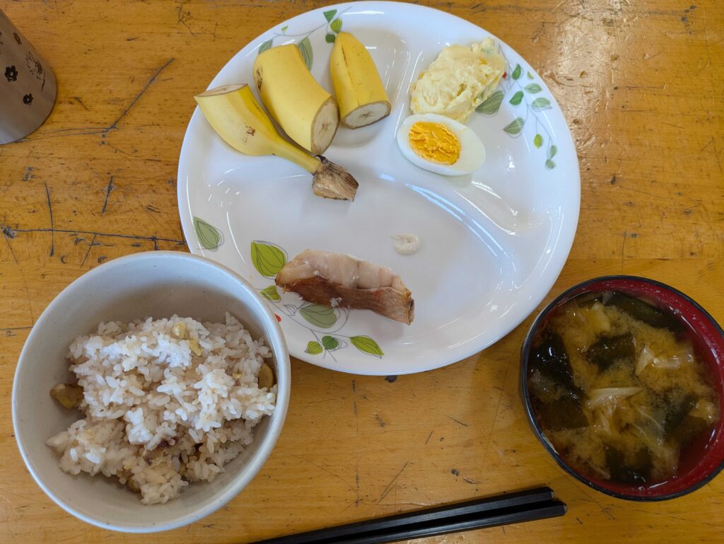 9月26日 朝食公開済み: 2025年9月26日更新: 2025年9月26日作成者: 管理者カテゴリー: かじかなごはん本日の朝食はこちら↓↓・赤魚の塩焼き・栗ご飯・ポテトサラダとゆで卵・みそ汁(まなさん作り置き)・バナナでした!朝学園生が「え!もう26日?」と驚いていました。朝番の冷え込みが徐々に強くなっていますが、なんだか日中は暖かいのでもうすぐ10月になる感じがしません。でもしっかり私の手は乾燥を感じとってかさついてきています・・・ 小金井関連記事 9月16日 夕食・ごはん ・チャプチェ(ナツさん作) ・お味噌汁 ・フレーク入りのクッキー クッキーは男子二人の力作! サクサクっと 上手に仕上がりました。 みんなにも大好評♪ ヤッタネ! かず公開済み: 2024年9月16日更新: 2024年9月17日作成者: 管理者カテゴリー: かじかなごはん 10月16日 朝食・パン ・スクランブルエッグ ・ミックスサラダ ・コーンクリームスープwithクルトン ・フルーツヨーグルト 日頃は、和食中心の生活をしている学園生たち。 週末の朝食でパンが出るのを楽しみにしているようです。 Y平君は、 […]公開済み: 2021年10月16日更新: 2021年10月16日作成者: 管理者カテゴリー: かじかなごはん 10月7日 夕食***はつよさんメニュー*** ■ごはん ■回鍋肉 ■いんげんの炒め物 ■サツマイモのレモン煮 ■みそ汁 いつも美味しいはつよさんメニュー。 サツマイモのレモン煮はデザート並に人気がありますが、今日は『学園 […]公開済み: 2024年10月7日更新: 2024年10月7日作成者: 管理者カテゴリー: かじかなごはん
