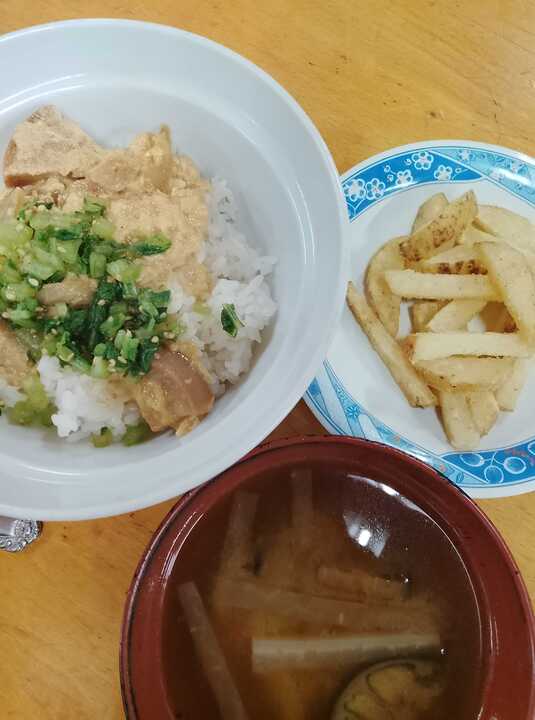 卵丼とお味噌汁に、フライドポテトを添えてみました。
