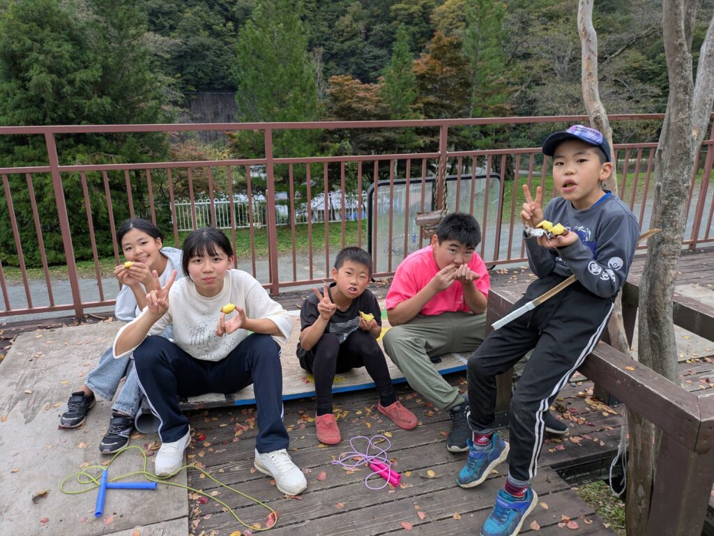芋が焼けるまで、学園生はなわとびをしたり虫を捕まえたり。