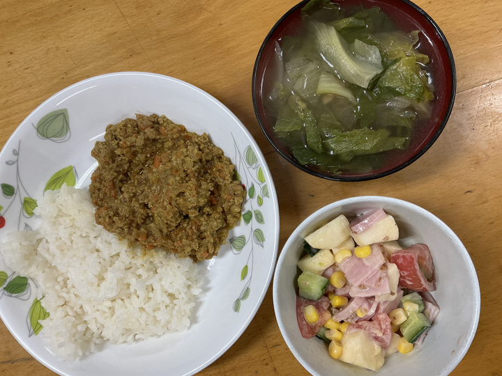 11月14日 夕食公開済み: 2025年11月14日更新: 2025年11月14日作成者: 管理者カテゴリー: かじかなごはん今日の晩ご飯は、マナさんごはんです!挽肉たっぷりのドライキーマカレー と カラフルサラダ それに 学園畑レタスとハムのスープ!サラダに入ってるリンゴには一瞬戸惑った生徒もいましたが、 「すごく良く合うんですね」と、すぐにお気に入り!スープもカレーも全部美味しかったーあっという間に完食です! さあさあ、楽しみな今週末に向かって、みんなゆくぞーごちそうさまでした。 つね関連記事 3月20日朝食・オムライス ・野菜サラダ ・白菜の浅漬け ・野菜スープ ・フルーツヨーグルト 薄焼きたまごは5年生A莉ちゃんにお任せしました。破けない様にするために水溶き片栗粉を混ぜる事を昨晩の料理教室で教えてくれました。確かに・・・ […]公開済み: 2021年3月20日更新: 2021年3月22日作成者: 管理者カテゴリー: かじかなごはん 2月5日 夕食まりこさんメニューの夕食です! ・マーボー豆腐 ・マカロニサラダ ・味噌田楽 ・キウイ ・玉子スープ ・ごはん 味噌田楽のこんにゃくは、万里子さんのお友達の手作りだそうです! 市販のこんにゃく特有の臭みも全くなく、プルプ […]公開済み: 2025年2月6日更新: 2025年2月6日作成者: 管理者カテゴリー: かじかなごはん 4月20日朝食・スクランブルエッグ ・ソーセージ ・グリーンサラダ ・みそ汁 ・チャーハン ・フルーツヨーグルト 今朝はちょっと寒い朝になりました。暖かい日は半袖の子も居ますが、今朝は全員上着を着てのごはんです。寒いからいっぱい食べな […]公開済み: 2022年4月20日更新: 2022年4月20日作成者: 管理者カテゴリー: かじかなごはん
