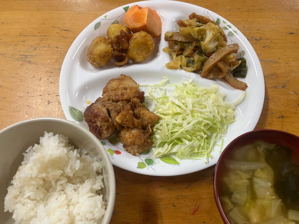 11月17日 夕食公開済み: 2025年11月18日更新: 2025年11月18日作成者: 管理者カテゴリー: かじかなごはん★はつよさんメニュー★ ・味噌マヨチキン ・キャベツとさつま揚げ炒め煮 ・ジャガイモ炒め ・みそ汁 ・ご飯 ・柿(いただきもの)はつよさんのお家でとれたジャガイモを持ってきて調理してくださりました!! はつよさん専属味見担当R太はジャガイモを味見させてもらいご満悦✨今日も美味しいご飯をありがとうございました🌟まな関連記事 4月7日 夕食本日の夕食は、はつよさんの特製です。 春休みを帰省して過ごして学園に帰ってきた継続生も、 私たち指導員も、はつよさんのごはんを頂いて、「いつもの暮らしに戻れたな」という安心感を覚えたのではないでしょうか。いつも美味しいご […]公開済み: 2025年4月7日更新: 2025年4月7日作成者: 管理者カテゴリー: かじかなごはん 6月1日 朝食■ねばねば丼(オクラの梅かつお和え/納豆/めかぶ/とろろ) ■ワカメスープ 写真を撮り忘れたので、片付け風景。 すっかり綺麗にされた配膳テーブルを、心の眼で眺めて下さい。 ほら、美味しそうな朝食が……。 & […]公開済み: 2025年6月1日更新: 2025年6月1日作成者: 管理者カテゴリー: かじかなごはん 1月30日昼食・ナポリタンスパゲッティー ・ハンバーグ ・コンソ玉子メスープ ハンバーグは昨晩JKさんが作っておいてくれました。温め過ぎで少し焦がしてしまいましたが とても美味しかったです。 チャレンジャーH人君は、お米 […]公開済み: 2021年1月30日更新: 2021年1月30日作成者: 管理者カテゴリー: かじかなごはん