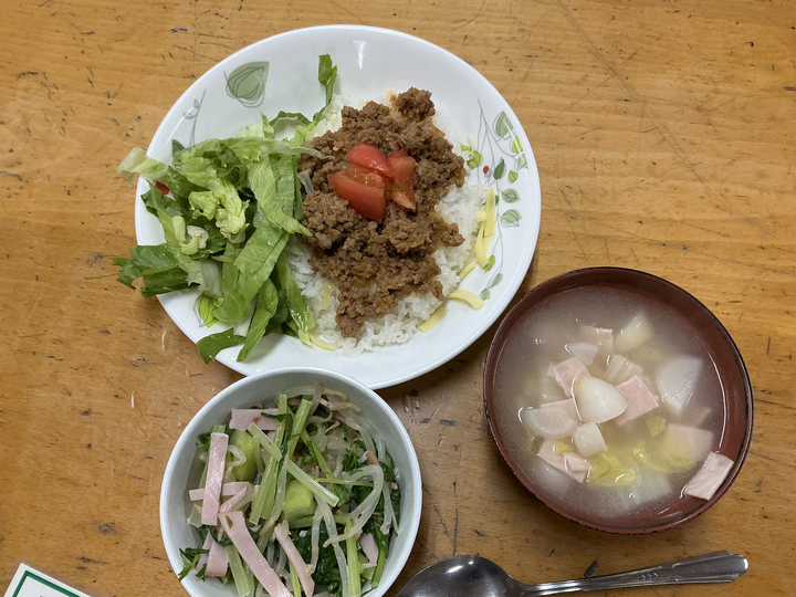 サラダにも、すでに定番になりつつある学園畑の水菜を使って。