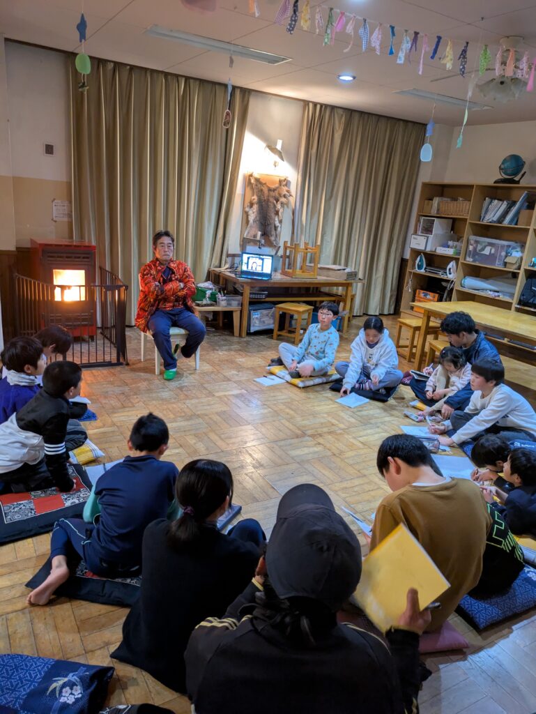 黒澤さんが初めてクマを仕留めた時の話。クマが入っていそうな洞穴や、木の根っこの下や洞などを見て回り、そこにいるクマを撃つという「アナグマ」という猟法。クマと顔を突き合わせるほどの距離で、後ろに転がされたり仕留めたり。クマと対峙した時の独特の緊張感などを、 まさに手に汗握る臨場感で話してくださり園生たちもお話の中に引き込まれます。