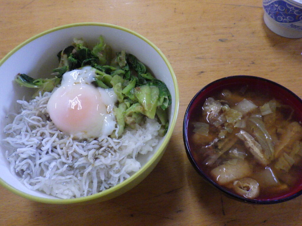 12月21日 朝食公開済み: 2025年12月21日更新: 2025年12月21日作成者: 管理者カテゴリー: かじかなごはん■シラス丼■みそ汁 シラス丼には温玉&学園チンゲン菜をトッピング。チンゲン菜はさっき採ってきたばかり。うーん贅沢。 /池関連記事 6月1日 朝食■ねばねば丼(オクラの梅かつお和え/納豆/めかぶ/とろろ) ■ワカメスープ 写真を撮り忘れたので、片付け風景。 すっかり綺麗にされた配膳テーブルを、心の眼で眺めて下さい。 ほら、美味しそうな朝食が……。 & […]公開済み: 2025年6月1日更新: 2025年6月1日作成者: 管理者カテゴリー: かじかなごはん 5月13日 昼食***マナさんメニュー*** ■根菜タップリ味噌煮うどん 七味(※私物)は『お好みで』なのですが、今期は学園生の消費量が多い! まぁ市販の安い物なので、辛さも『お察しレベル』だから刺激が足りないのかも。 今 […]公開済み: 2023年5月13日更新: 2023年5月14日作成者: 管理者カテゴリー: かじかなごはん 2月16日 朝食本日の朝食メニュー ■ブリの塩焼き ■ほうれん草とベーコンのバター炒め ■ご飯 ■みそ汁 ■バナナ 本日は中学校授業参観! 元気に行ってらっしゃい! たんご公開済み: 2024年2月16日更新: 2024年2月16日作成者: 管理者カテゴリー: かじかなごはん