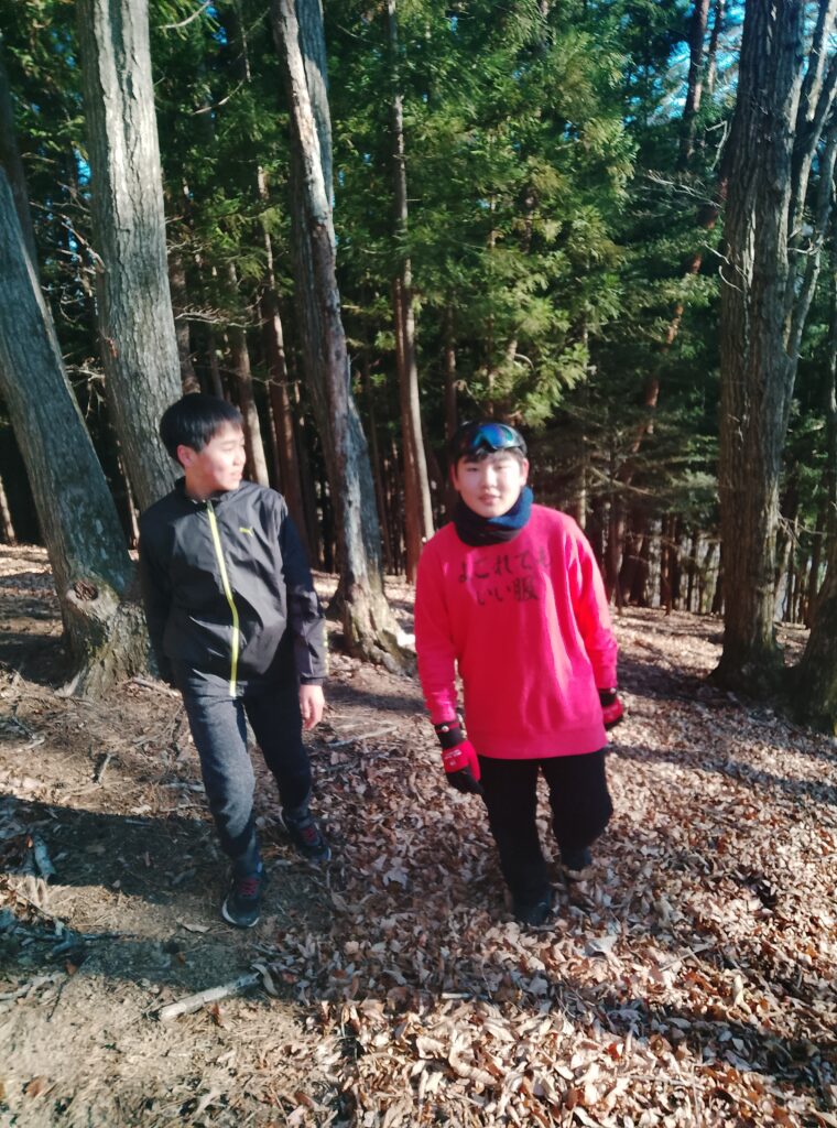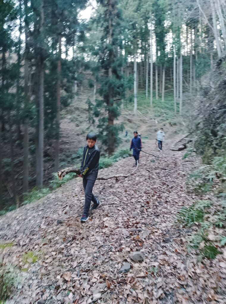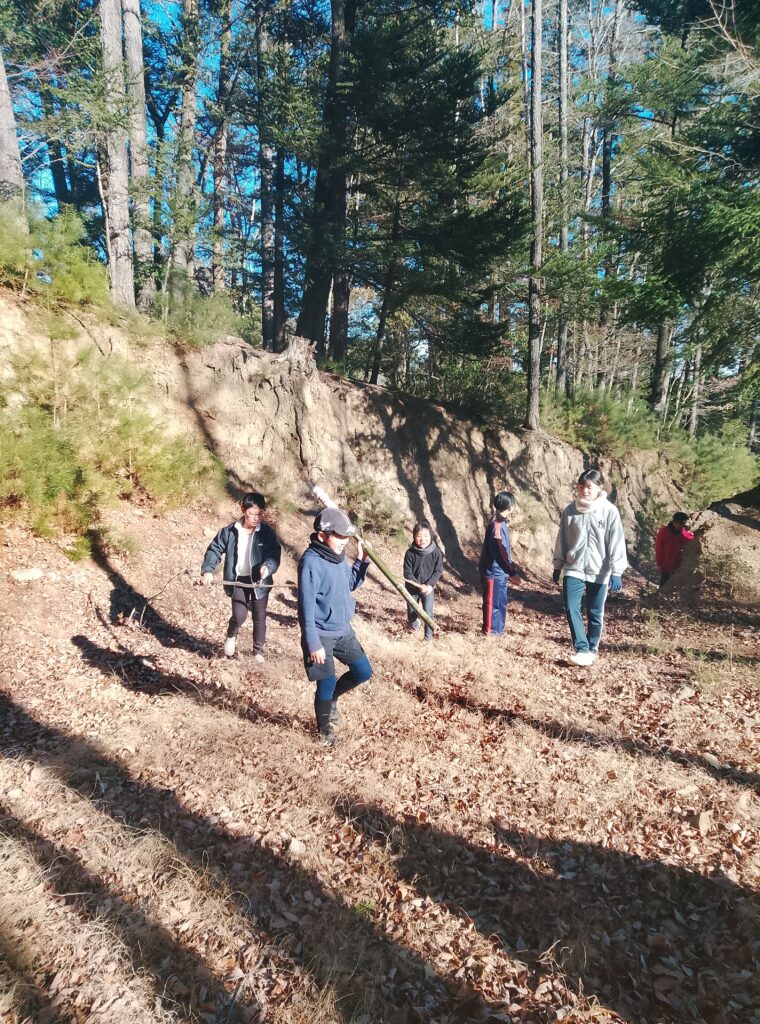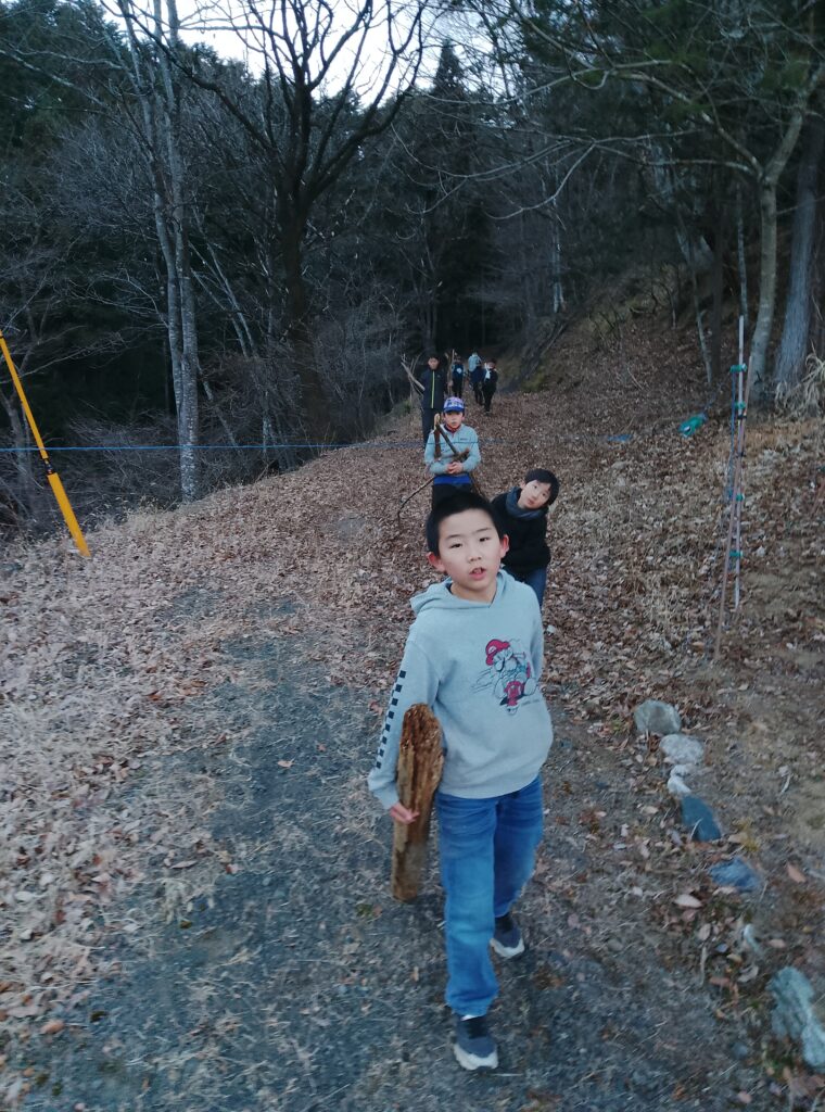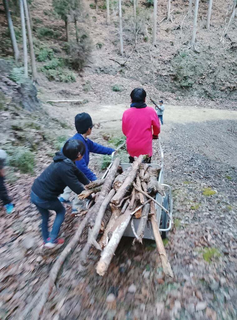 帰りは焚火用の薪になる、「枯れっこ」(林道に落ちているもの)を集めてきます。化石燃料が普及する前の村の暮らしでは、子供たちが担った毎日の大切な労働です。遊びと労働がともにあった、山村の伝統にならって、学園生も暮らしています。