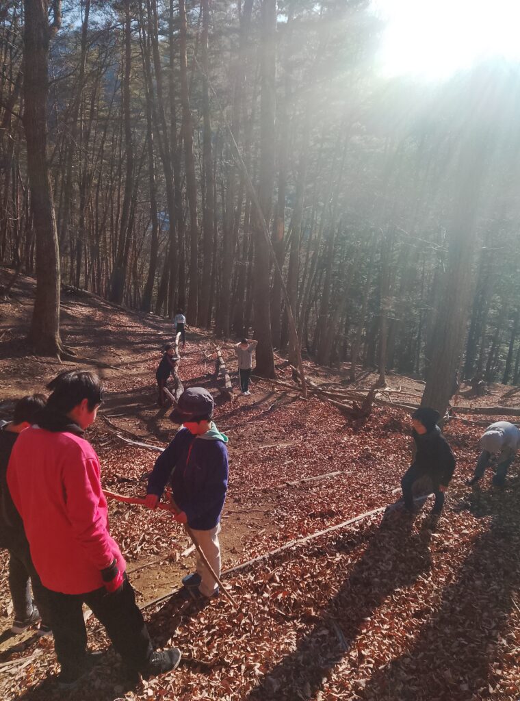 落ち葉プールのほかにも、山に横たわる枯れ木や枯れ枝を組んで建物を作ったりしている子らも。続きを造りに、またすぐにでも出かけたい!という声が多数あります。