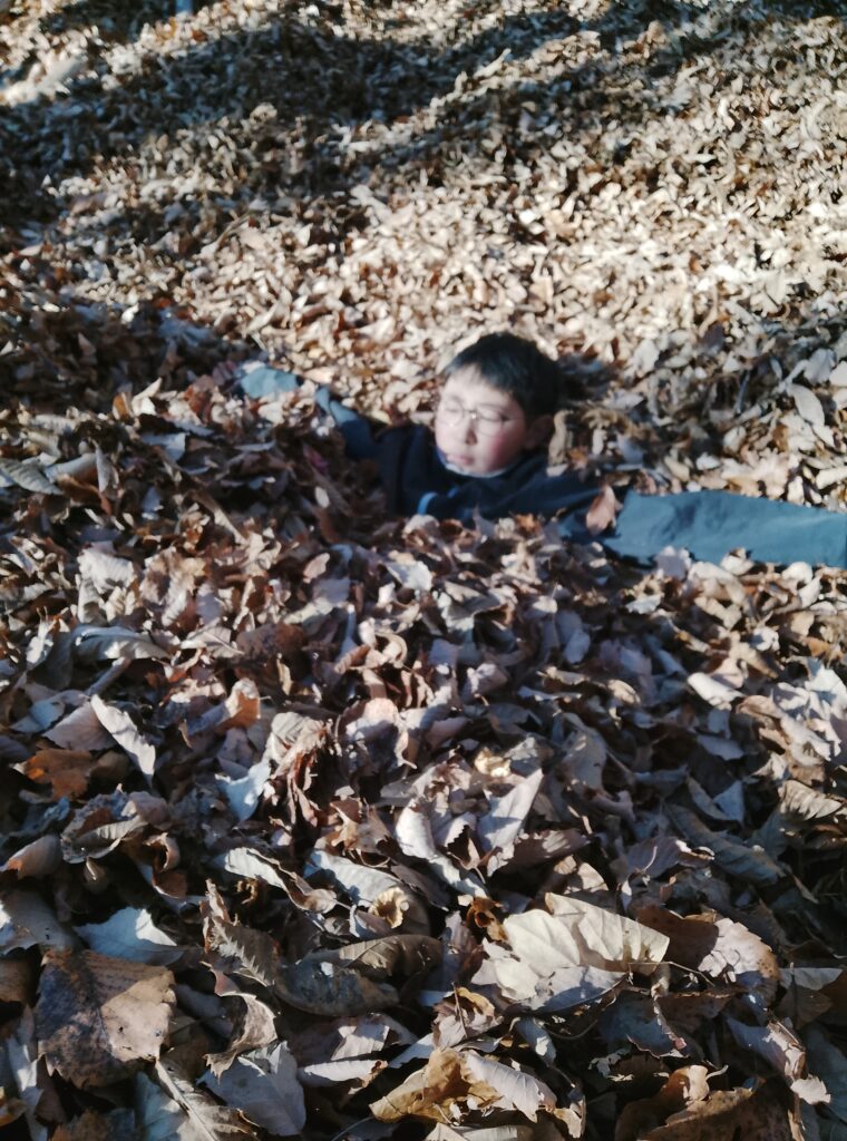 かじかの里学園名物「落ち葉プール」じゃ~!
