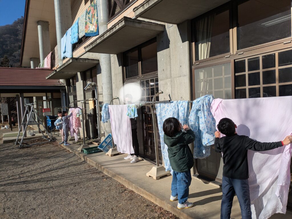 体験生、使用した布団を干して