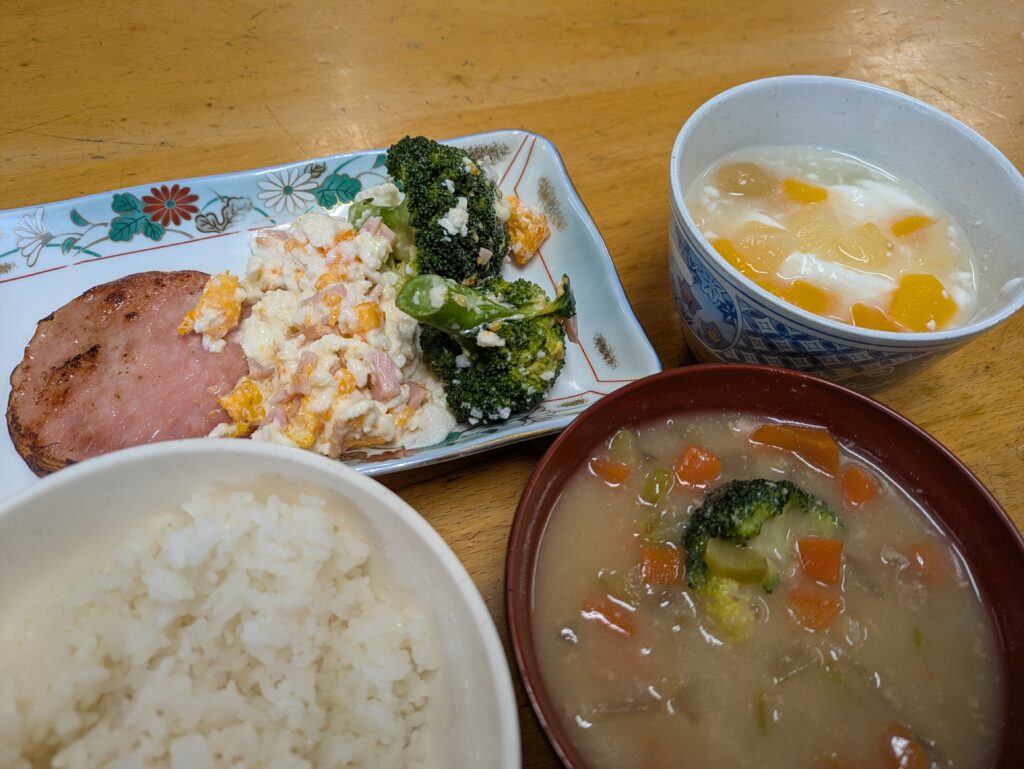 2月18日 朝食公開済み: 2026年2月18日更新: 2026年3月3日作成者: 管理者カテゴリー: かじかなごはん ・ごはん ・焼きハム ・ゆでない玉子サラダ ・ブロッコリー ・具だくさんスープ ・フルーツヨーグルトゆでない玉子サラダ 殻をむく手間は省けるから 時短料理でオススメです!かず関連記事 9月5日 夕食,゚.:。+゚Kさんメニュー☆ ・具だくさんシチュー ・彩りサラダ 新学期が始まり、学園生の胃袋もだんだん学園仕様に戻ってきたようで、みんなガツガツモリモリ食べています(*^O^*) たっぷりシチューを作っ […]公開済み: 2022年9月5日更新: 2022年9月5日作成者: 管理者カテゴリー: かじかなごはん 7月23日 昼食・シーフードパスタ ・グリーンサラダ お腹を空かせて部活から帰ってきた中学生二人はしっかり完食してくれました。 そして、ごちそうさまをしたあとさっそく、 昨日お迎えにきた保護者の方がお土産に持ってきてくれたゼリーを作り始 […]公開済み: 2021年7月23日更新: 2021年7月23日作成者: 管理者カテゴリー: かじかなごはん 9月1日夕食《 はつよさんごはん 》 ・豚肉とナスと玉ネギの美味しい炒め ・美味しい野菜ソテー ・キュウリの美味しい塩揉み ・新鮮とうもろこし ・あつあつみそ汁 ・ホッカホカご飯 黙想・・・ それでは、いただきましょう […]公開済み: 2022年9月1日更新: 2022年9月2日作成者: 管理者カテゴリー: かじかなごはん